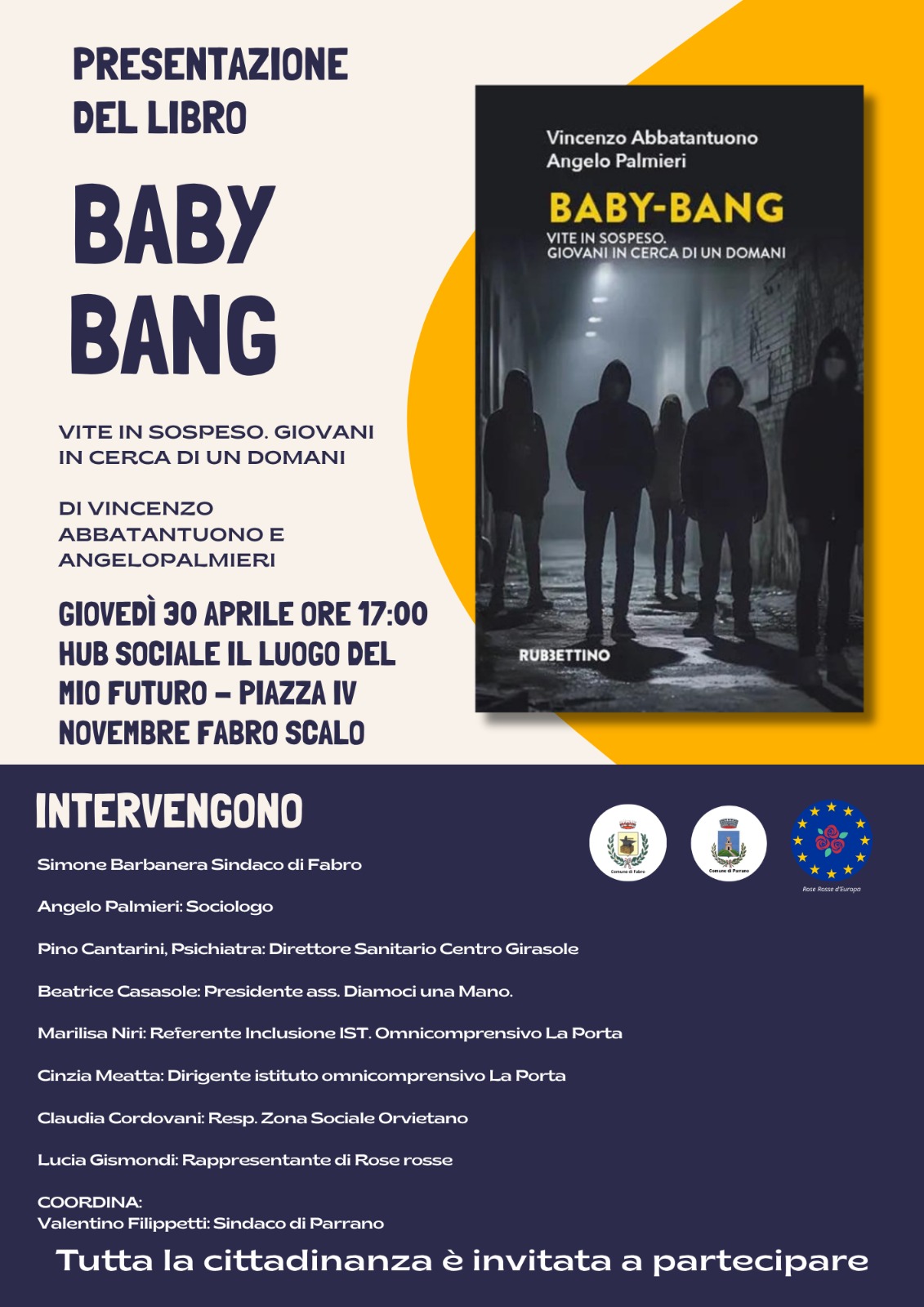Giovedì 30 aprile alle ore 17:00, all’Hub Sociale “Il Luogo del Mio Futuro” di Piazza IV Novembre a Fabro Scalo, viene presentato il libro Baby-Bang. Vite in sospeso. Giovani in cerca di un domani, scritto da Vincenzo Abbatantuono e Angelo Palmieri, edito da Rubbettino.